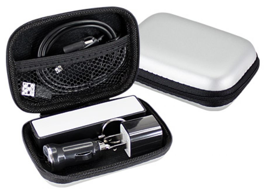 Kit de Conexión para Automóvil Kit de Conexión para el Automóvil. Contiene cargador USB para encendedor / toma de corriente del automóvil, Power Bank de 2500 mAh, toma-corriente con terminal USB y multi-cable adaptador USB de 1m de largo, con 3 terminales para iPhone / Samsung / Type C. Presentación en estuche EVA pouch plateado con interior negro, en caja de cartulina plateada.